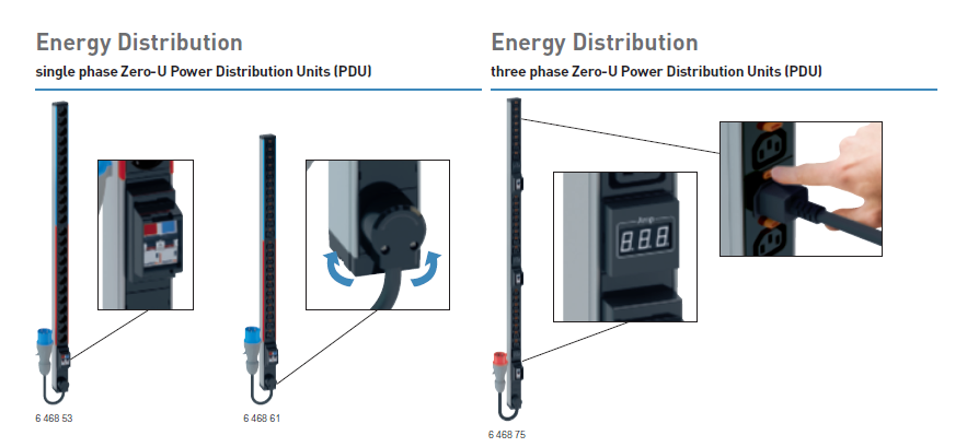 | To provide A electric power for IT equipments in 19" enclosures Single phase 230 V - 50/60 Hz power supply Zero-U PDU for vertical mounting in the cabinet (see p. 18-19 for dimensions) PDU with 2 circuits protected by 16 A uni+neutral MCB in a support with projecting edges to avoid accidental breakdown Each circuit is identified by color coding The total number of outlets is distributed equally between the 2 circuits 330° rotating cable input for a perfect orientation of the cable and no interference in the cabinet 2P+E outlets: - C13 and C19 standard outlets are equipped with cord locking system to avoid any accidental disconnection. Universal solution compatible with all the cords (C14 plugs for C13 and C20 plugs for C19) - French, German and British standard outlets are equipped with shutters - French and German standard outlets are inclined at 55° Delivered with 2 sets of metallic mounting brackets (see details p. 18-19): - Button brackets. For quick fixing and variable pitch - Standard brackets. For screw fixing Blackmodules (outlets and functions). Aluminium profile | To provide A electric power for IT equipments in 19" enclosures Three phase 380 V - 50/60 Hz power supply Zero-U PDU for vertical mounting in the cabinet (see p. 18-19 for dimensions) Each circuit is protected by 16 A single pole MCB in a support with projecting edges to avoid accidental breakdown 1 circuit per phase, each with 6 IEC 60320 C13 outlets and 2 IEC 60320 C19 outlets 330° rotating cable input for a perfect orientation of the cable and no interference in the cabinet C13 and C19 standard outlets are equipped with cord locking system to avoid any accidental disconnection. Universal solution compatible with all the cords (C14 plugs for C13 and C20 plugs for C19) Delivered with 2 sets of metallic mounting brackets: - Button brackets. For quick fixing and variable pitch - Standard brackets. For screw fixing Blackmodules (outlets and functions) Aluminium profile |